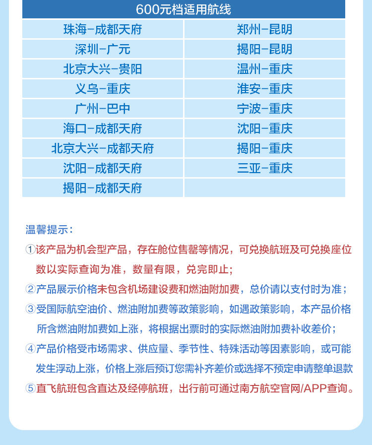 5. 机票必须按顺序使用(去程未用,回程也不能用),否则南航有权取消后续行程的机位, 由此可能发生的费用增加由您自行承担。