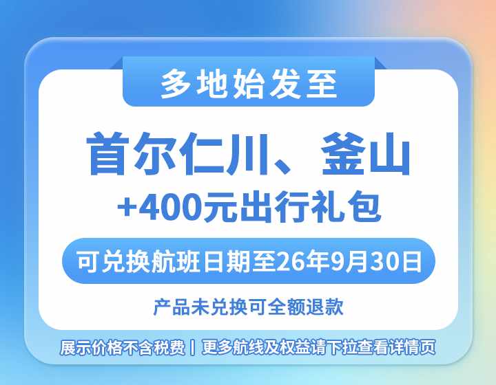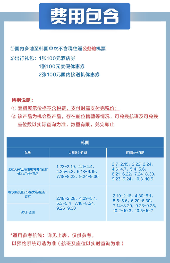 【臻享全球】国内至韩国单次往返公务舱机票次卡(享400元出行礼包)
