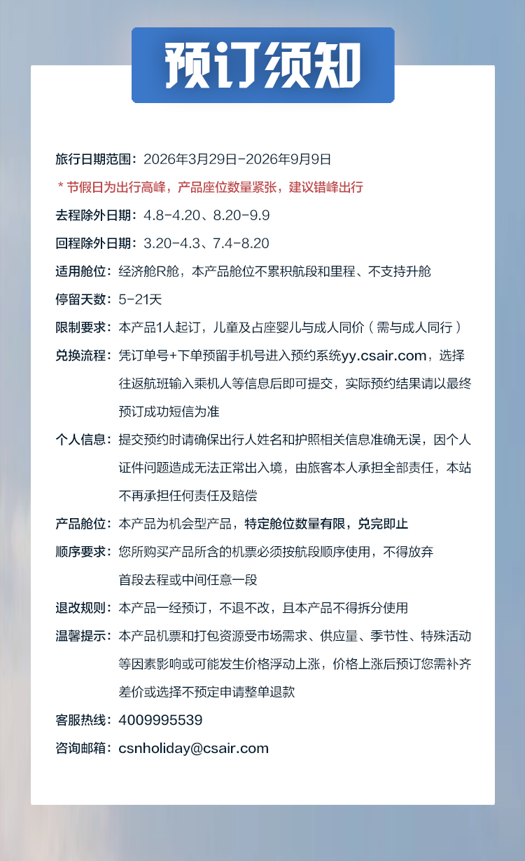 7. 如对本产品有任何疑问,请咨询客服4009995539或发邮至csnholiday@csair.com。