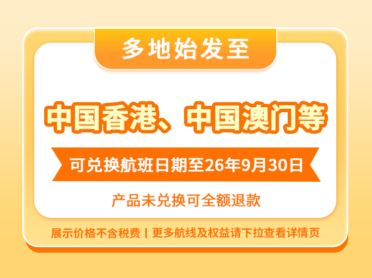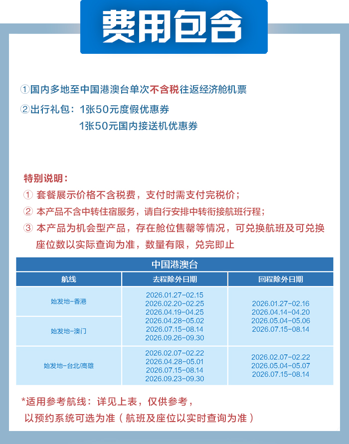 【畅游中国港澳台】国内多地至中国港澳台单次往返经济舱机票套餐(享100元出行礼包)