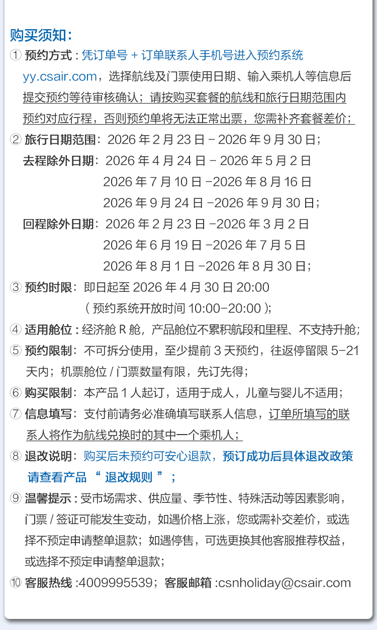 7. 如对本产品有任何疑问,请咨询客服4009995539或发邮至csnholiday@csair.com。
