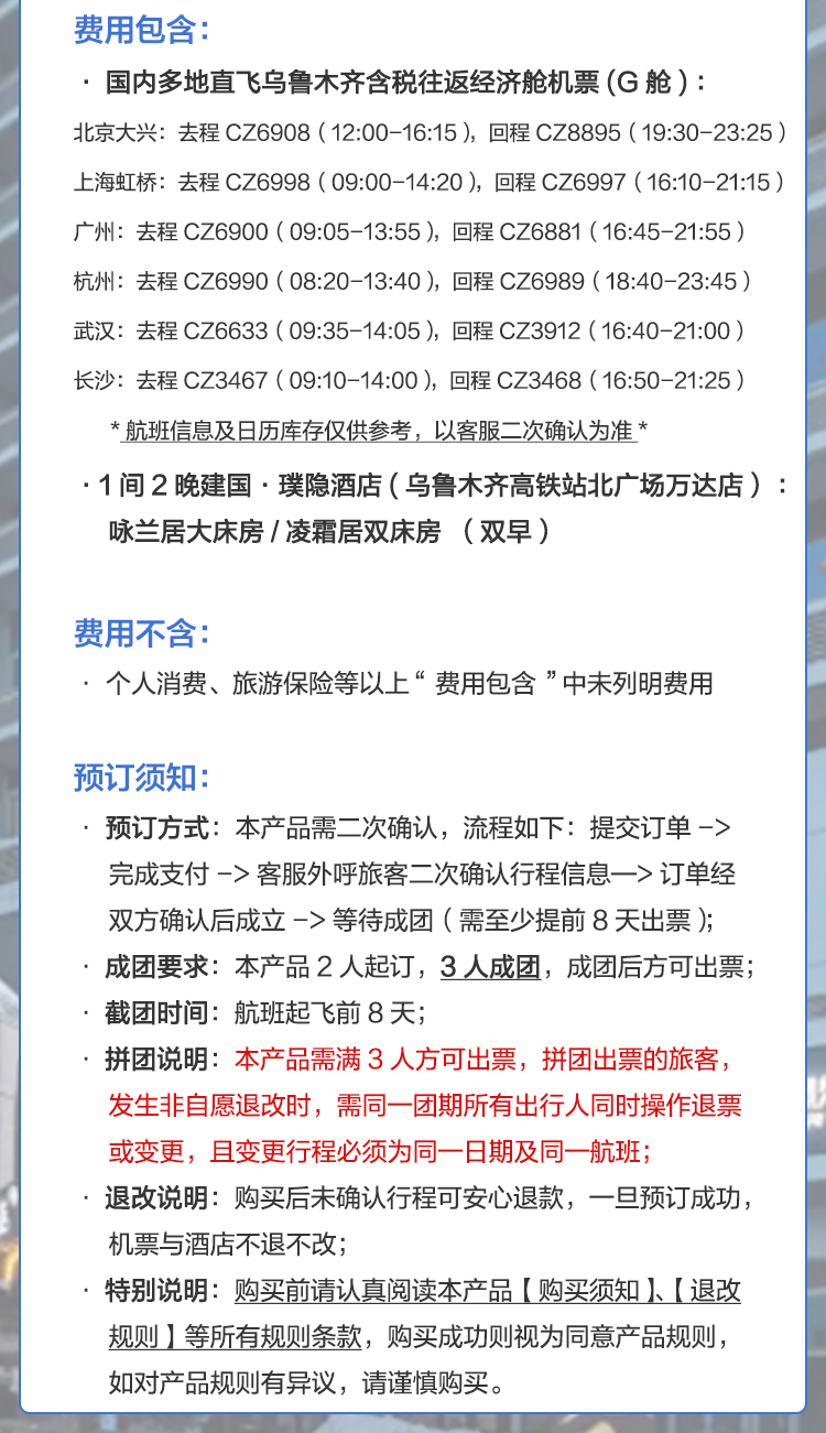【畅玩乌鲁木齐·五一】国内多地直飞乌鲁木齐7天6晚自由行(含税机票+2晚建国•璞隐酒店(乌鲁木齐高铁站北广场万达店))