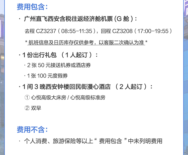 【畅玩西安】广州直飞西安4天3晚自由行(含税往返机票+1份出行礼包/3晚西安钟楼回民街漫心酒店)