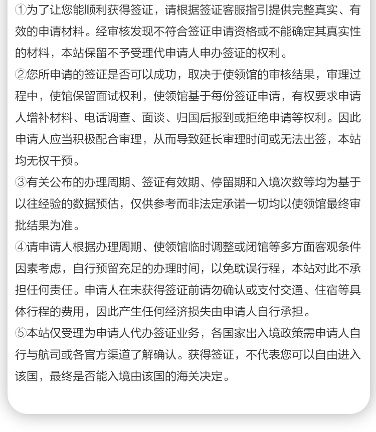 5. 请及时向客服确认出行日期,签证的有效期是从资料齐全进入使馆后开始起算,建议申请人离出行前30天办理签证(电子签建议提前5天)以便确认申请办理签证。