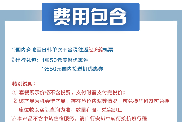 【国际次卡】国内至日韩单次往返经济舱机票(享价值100元出行礼包)