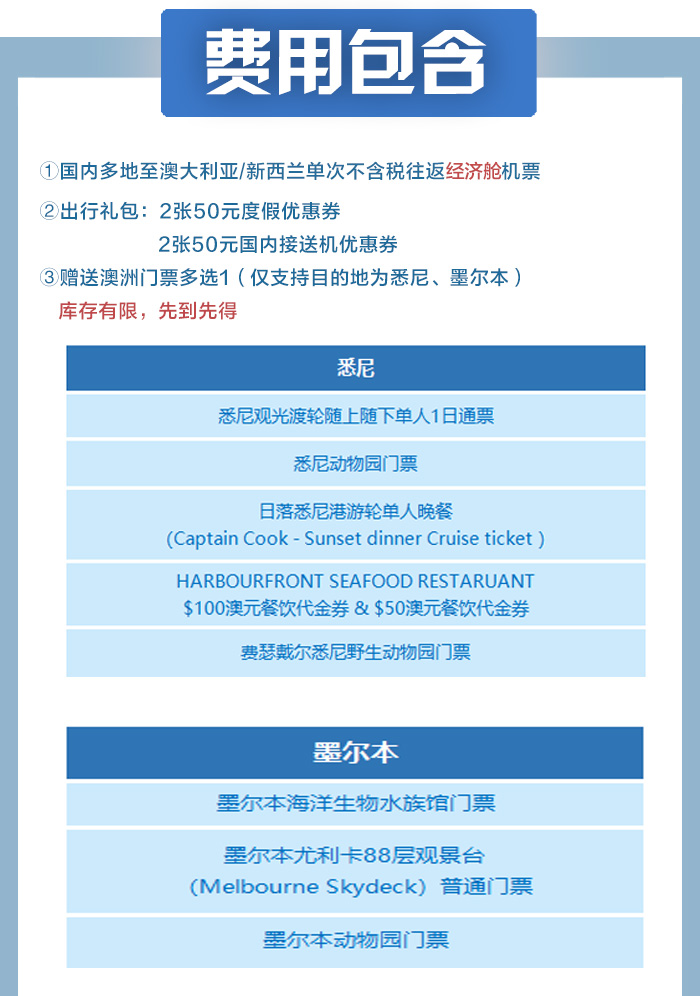 【国际次卡】国内至澳大利亚/新西兰单次往返经济舱机票(享价值200元出行礼包)